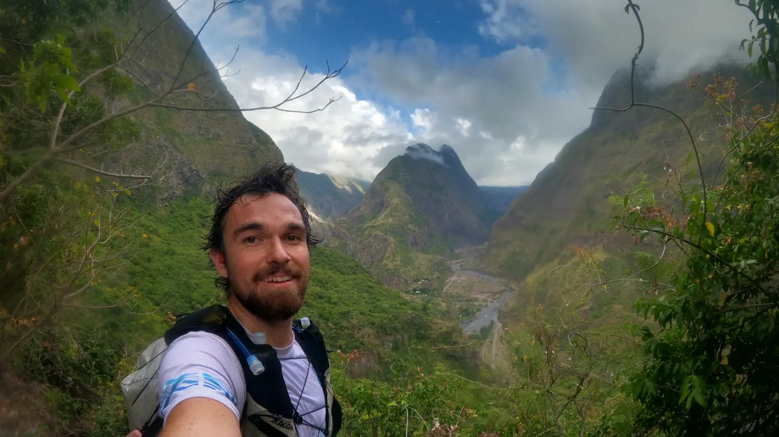 Arrivé à la gare, je temporise. Un café, puis deux, et enfin un dernier. Après celui-ci, plus de retour en arrière, l'aventure démarre. Je ressens de la solitude, mais elle n'est rien par rapport à ma détermination. 8h55, lancement de la montre et direction le sentier du GR R2. La chaleur est lourde et étouffante, mais je sais qu'elle ne durera pas et y suis mentalement préparé. Après quelques kilomètres de bitume, c'est parti pour la première grosse montée. 2000 m de D+ sur une vingtaine de km. Je croise des groupes de jeunes en promenade scolaire qui souffrent eux aussi de la chaleur, mais restent vaillants et soudés dans l'effort. À chaque fois, nous nous encourageons mutuellement et cela fait du bien. Les Réunionnais.es, à tout âge, dégagent une sympathie et une bienveillance dont je me souviendrai.