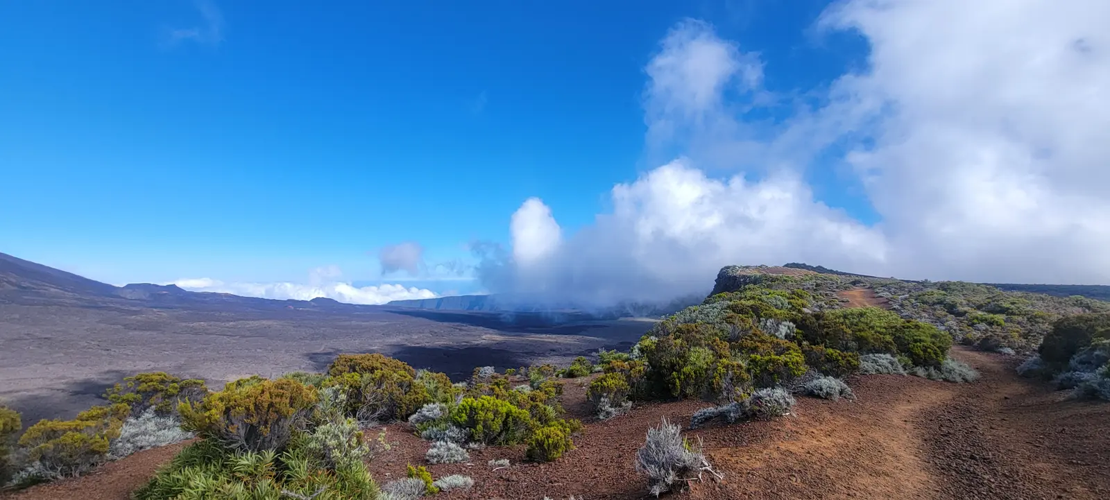 Arrivé au relais du Pas de Bellecombe en haut de la caldera, mes réserves de flotte s'amenuisent. J'ai encore 2.5L, mais il me reste 37 km à parcourir et il fait diablement chaud à cette heure méridienne. Les petites bouteilles de 50 cL sont affichées à 4€ (du vol) mais tant pis, j'en prends deux. Le karma se manifeste puisque le gars oublie de m'en compter une ce qui me fait excessivement kiffer. J'engloutis un plat lyophilisé, m'allonge 5 min en pleine cagne, puis go explorer la caldera. La plupart des gens ici sont venus en voiture, et beaucoup d'entre eux se contentent de regarder la vue, d'aller chercher une collation au relais, puis de repartir. Je me sens un peu étranger à ce type de congénères. J'ai la confirmation que cette façon de consommer le voyage n'est plus celle qui m'anime. Ce que j'aime, c'est en voir moins, mais le faire par mes propres moyens, en bus, en vélo, en courant. La sensation d'accomplissement ressentie lorsqu'on arrive à un point d'intérêt n'en est que décuplée.